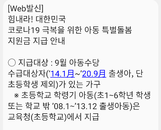 아동수당 지급에 관련된 문자가 도착했습니다